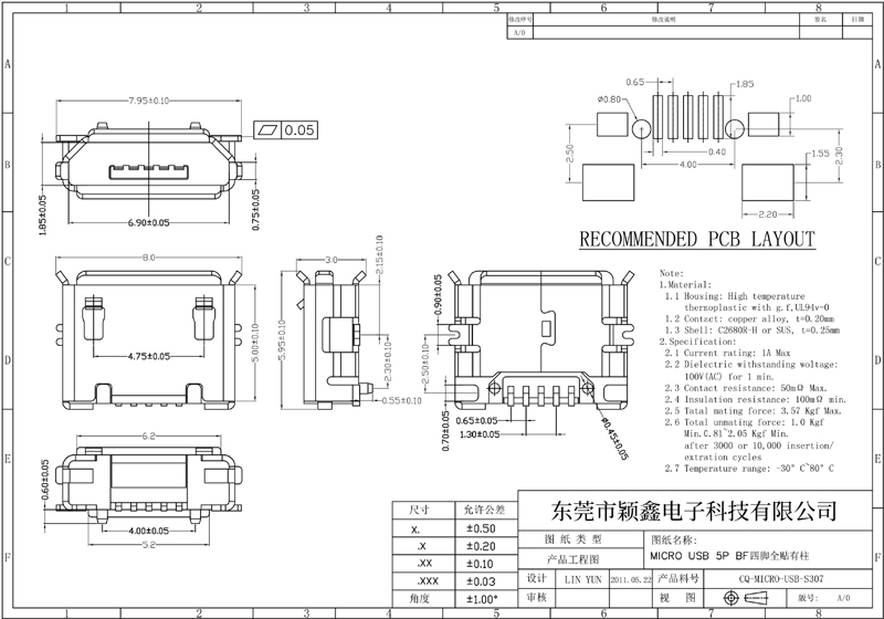 接觸阻抗:30mΩ MAX.INITIAL;40mΩ MAX AFTER 10000CYCLES