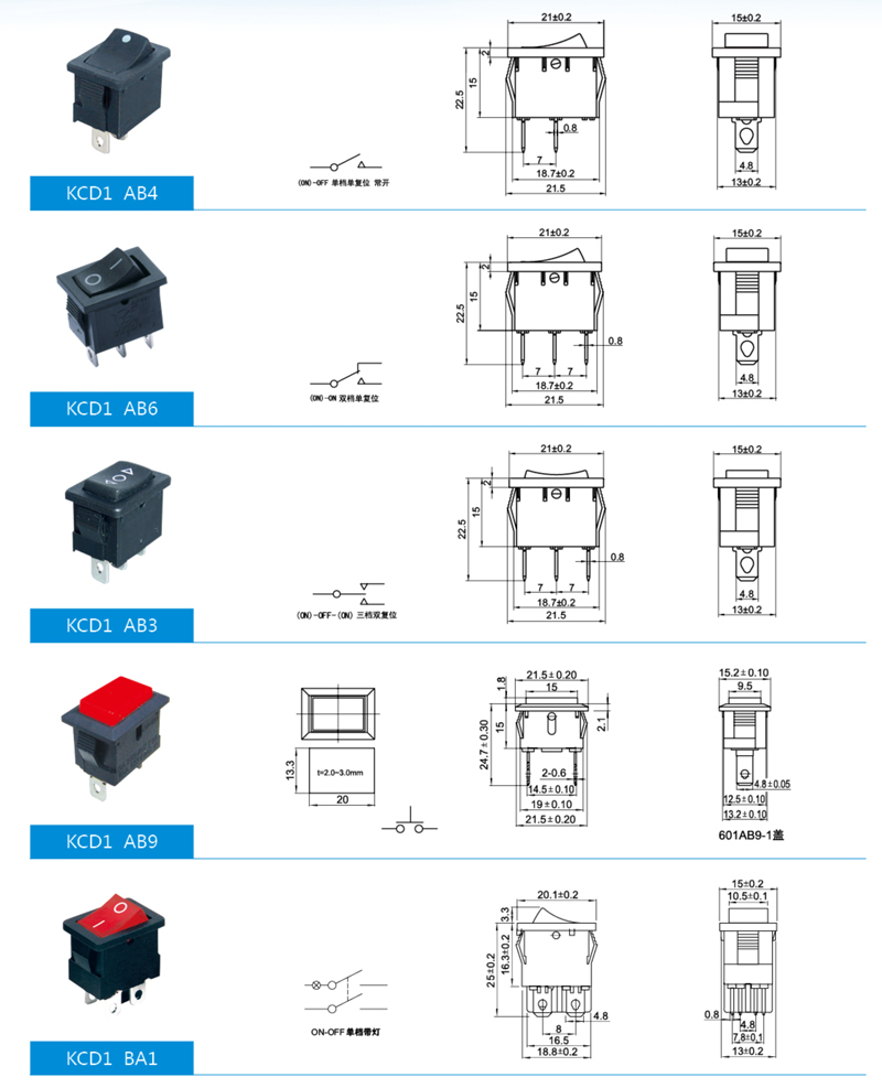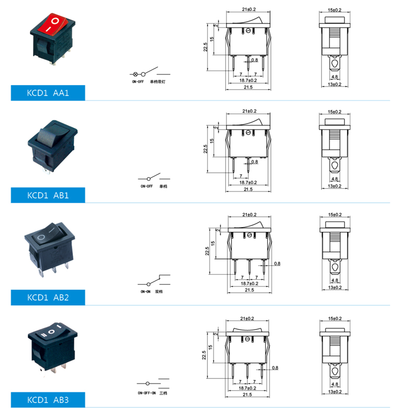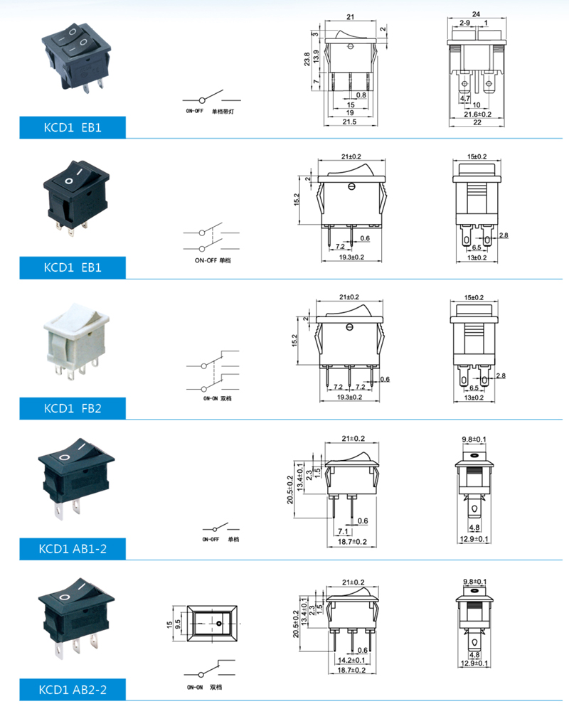 產(chǎn)品簡介:船型開關(guān)也稱翹板開關(guān)。其結(jié)構(gòu)與鈕子開關(guān)相同,只是把鈕柄換成船型。船型開關(guān)常用作電子設(shè)備的電源開關(guān),其觸點(diǎn)分為單刀單擲和雙刀雙擲等幾種,有些開關(guān)還帶有指示燈。 單刀單擲:1個動觸點(diǎn)和1個靜觸點(diǎn)。只有1通道 單刀雙擲:1個動觸點(diǎn)和2個靜觸點(diǎn),(可分別接通兩邊的靜觸點(diǎn)) 雙刀單擲,2個動觸點(diǎn)和2個靜觸點(diǎn),有2個通道 雙刀雙擲,2個動觸點(diǎn)和4個靜觸點(diǎn),有4個通道 (可分別接通兩邊的2個靜觸點(diǎn))